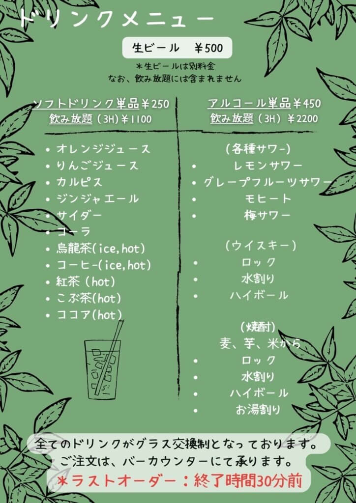 ただしアルコール飲み放題に生ビール・カクテル各種は含まれていませんのでご注意ください。