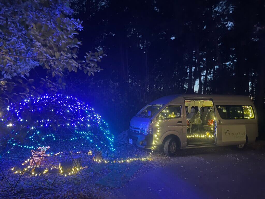 手作りキャンドルを作成し、クリスマスの夜に灯す幻想的な体験です。日が暮れてくる頃には会場内でキャンドルサービスやイルミネーションが点灯し、送迎車もクリスマス仕様となって皆様をお迎えします。